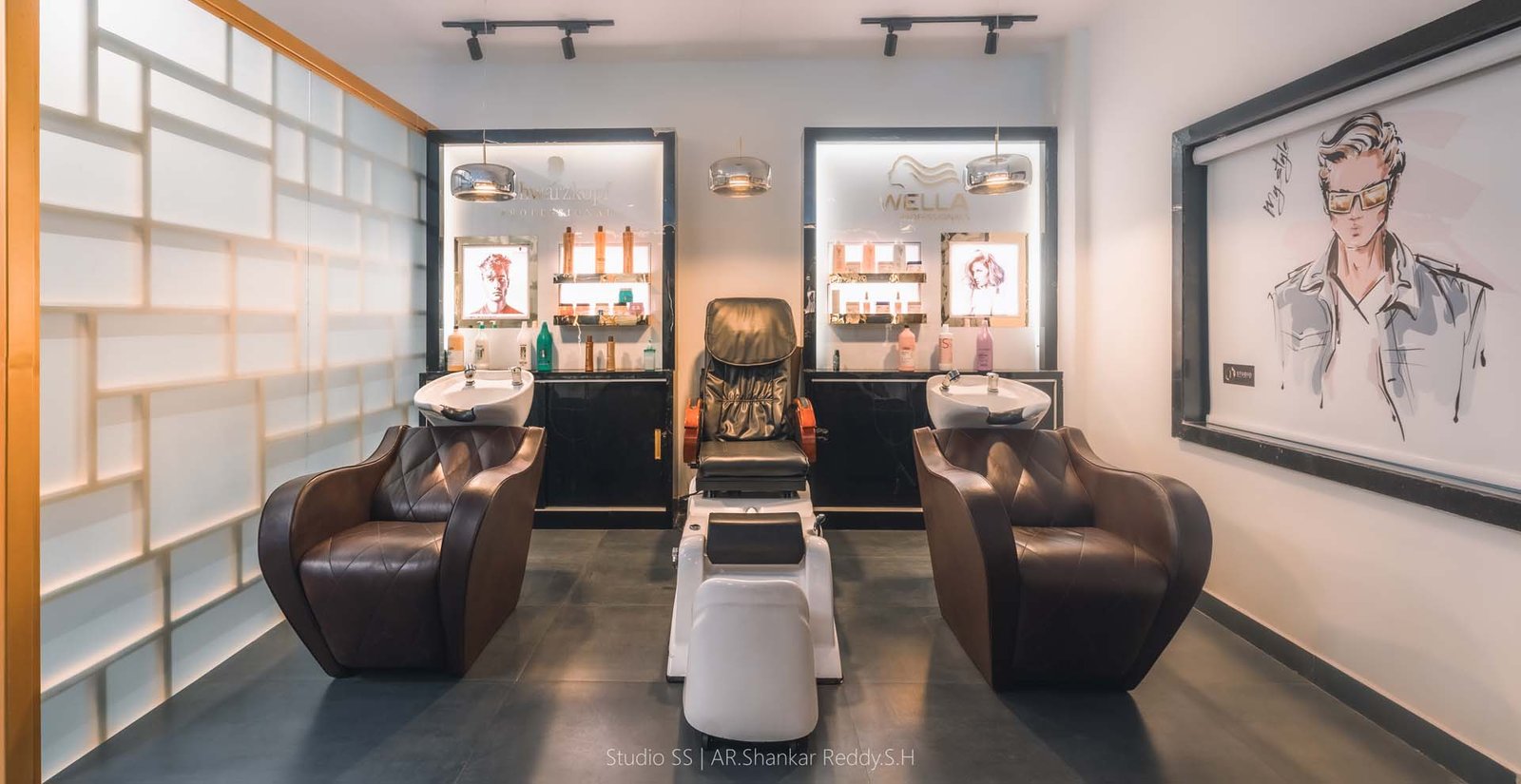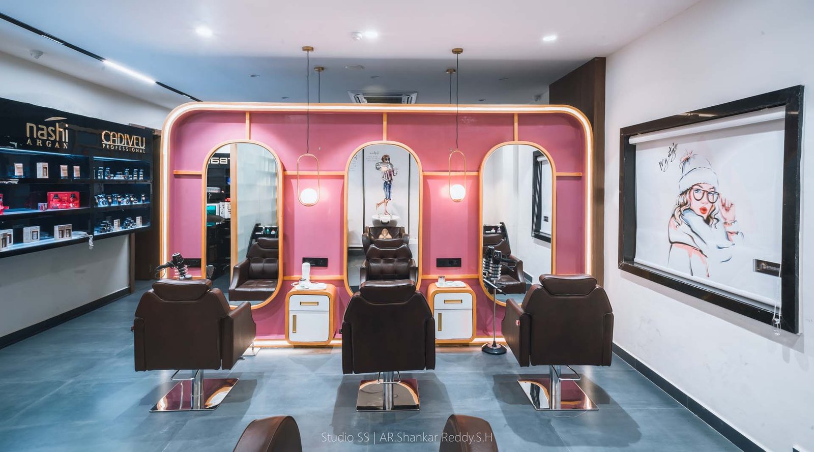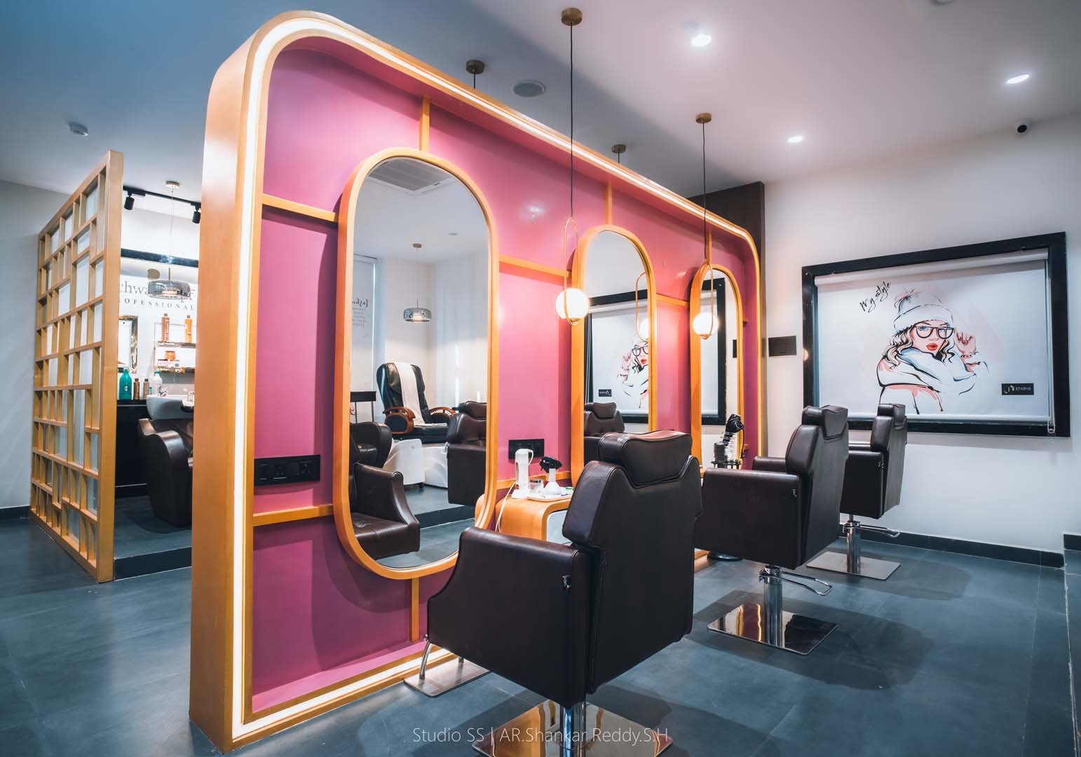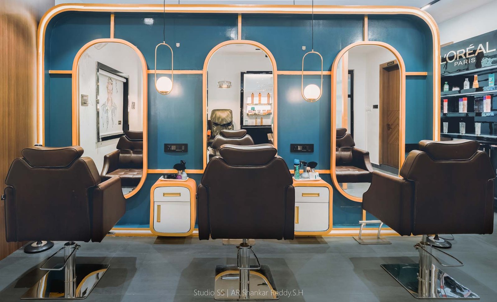 Each styling station is thoughtfully equipped with plush, ergonomic chairs, well-lit mirrors framed in soft gold tones, and dedicated storage units for a seamless, clutter-free experience.