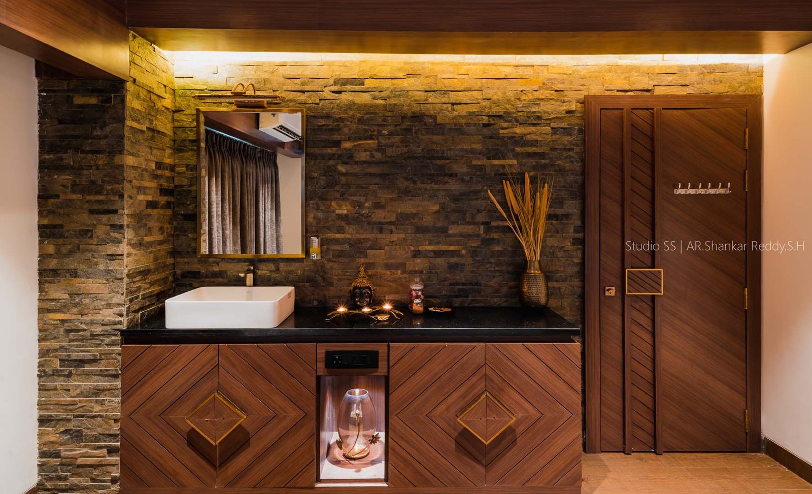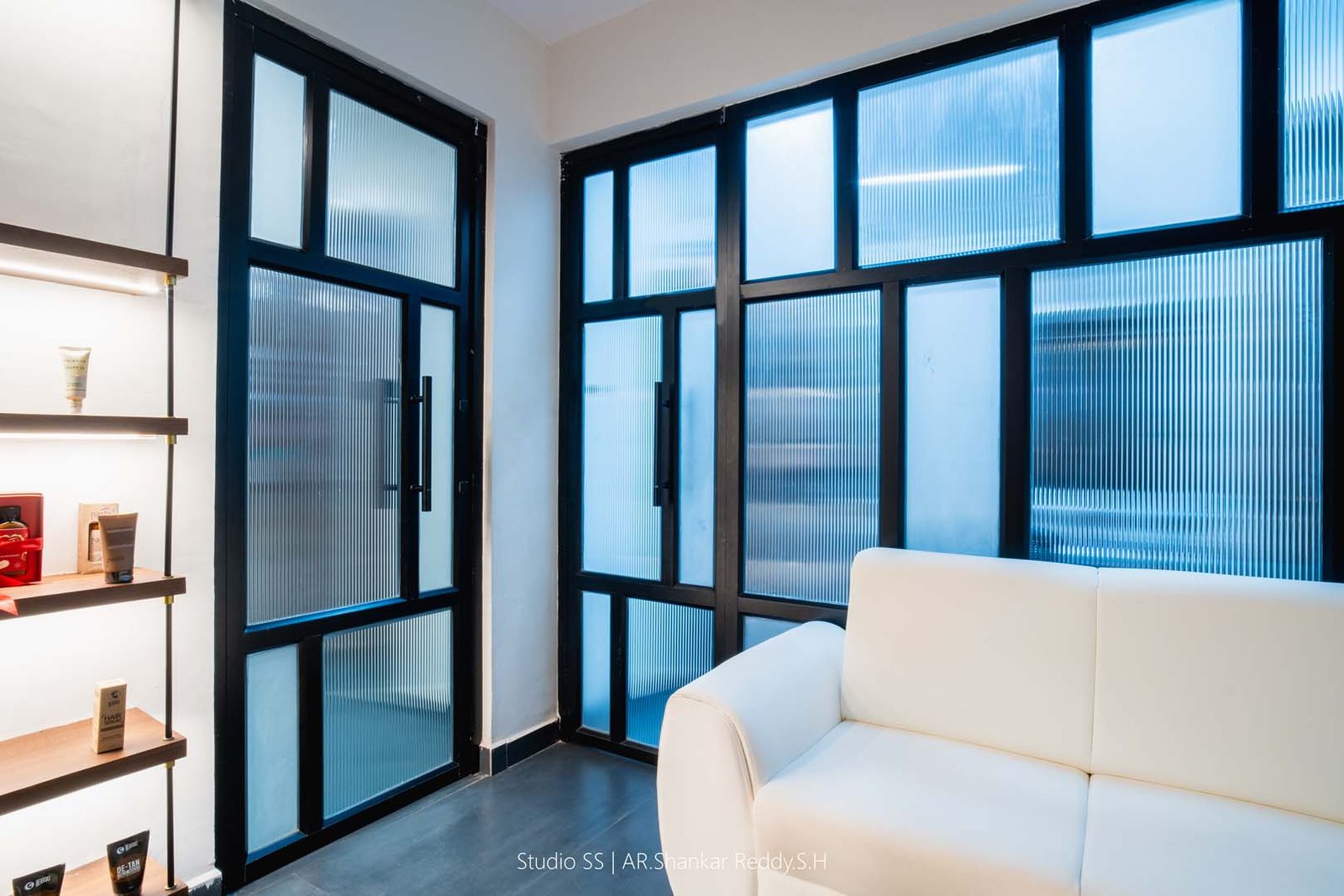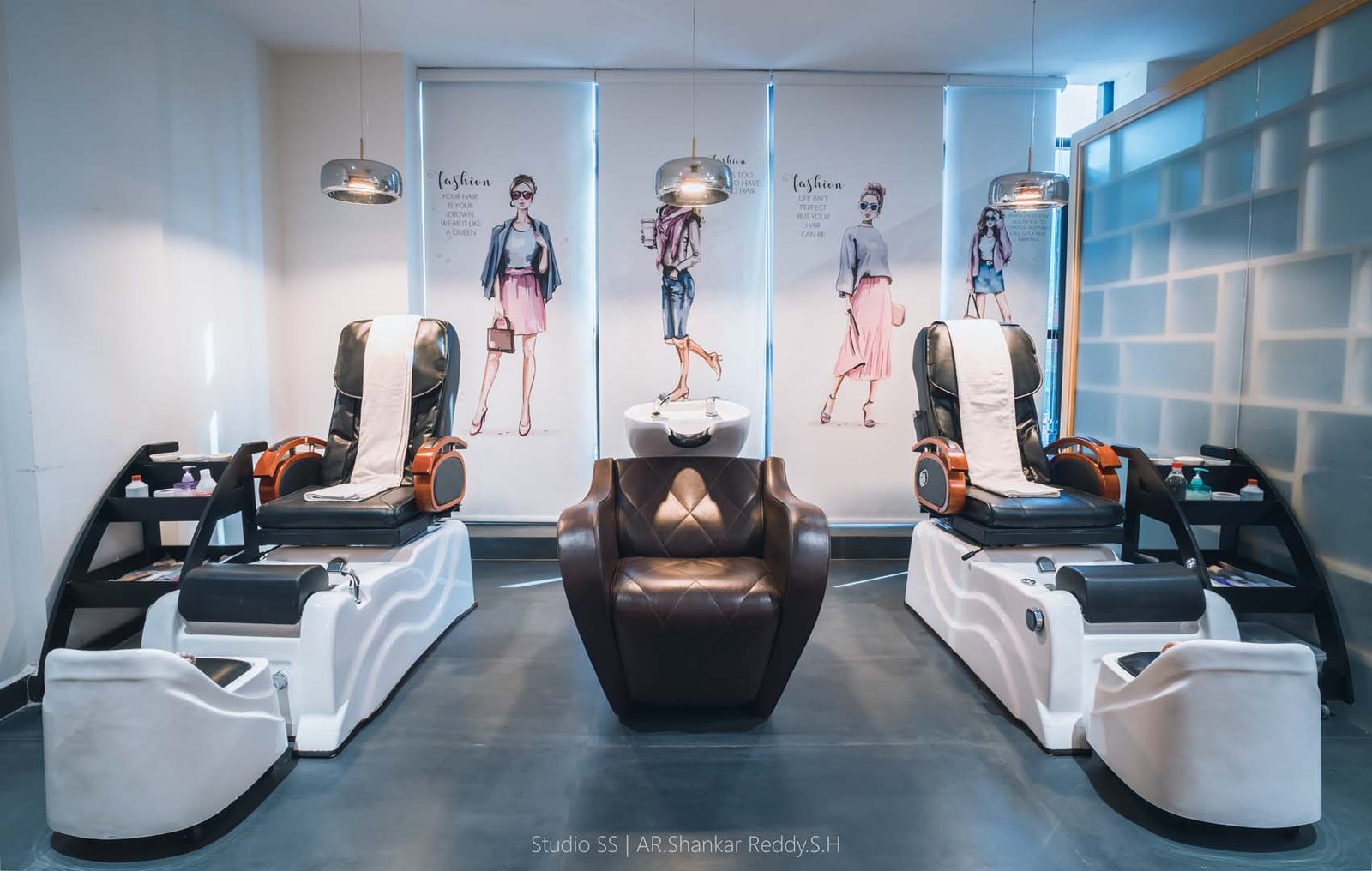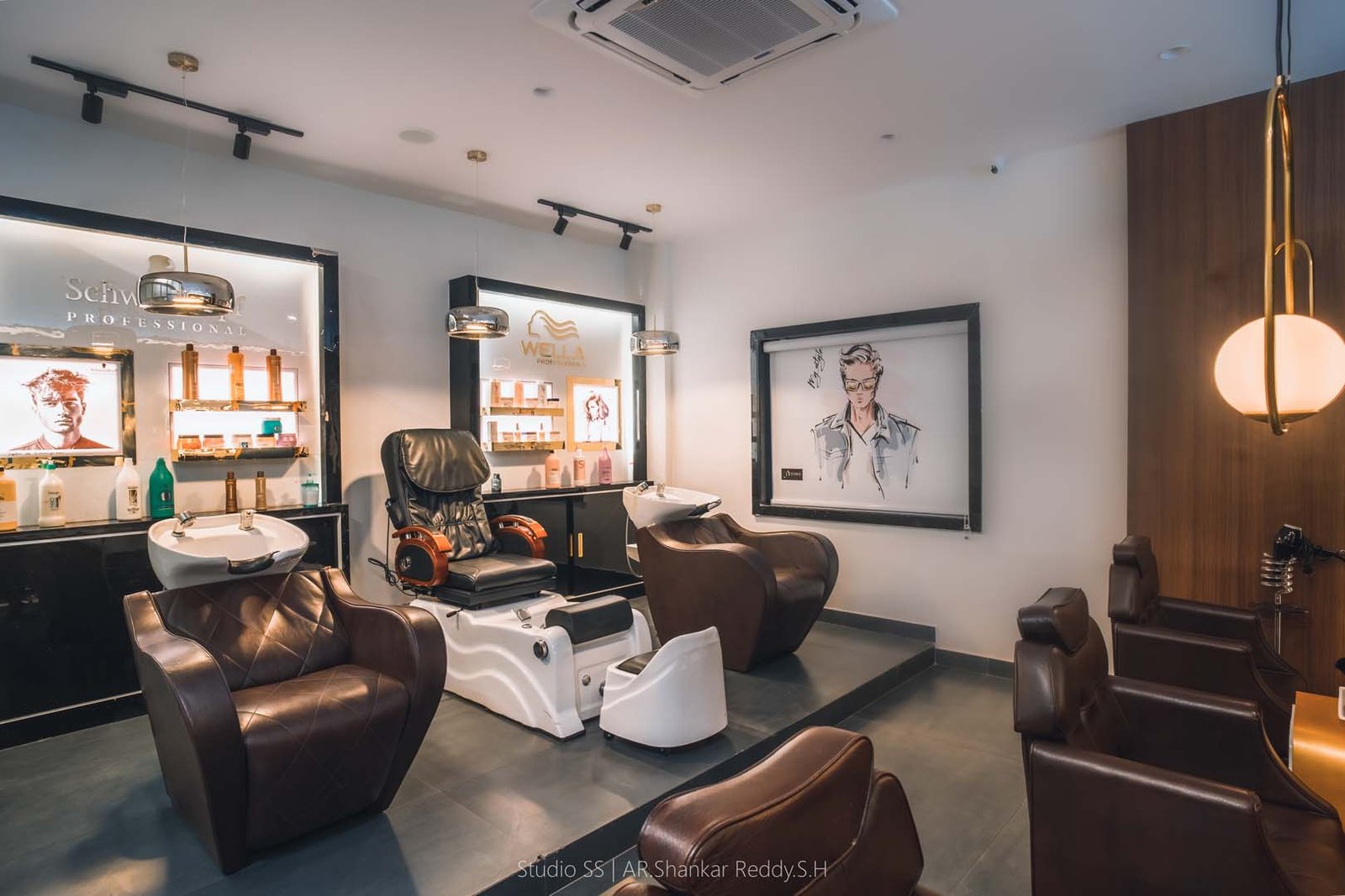 Each styling station is thoughtfully equipped with plush, ergonomic chairs, well-lit mirrors framed in soft gold tones, and dedicated storage units for a seamless, clutter-free experience.
