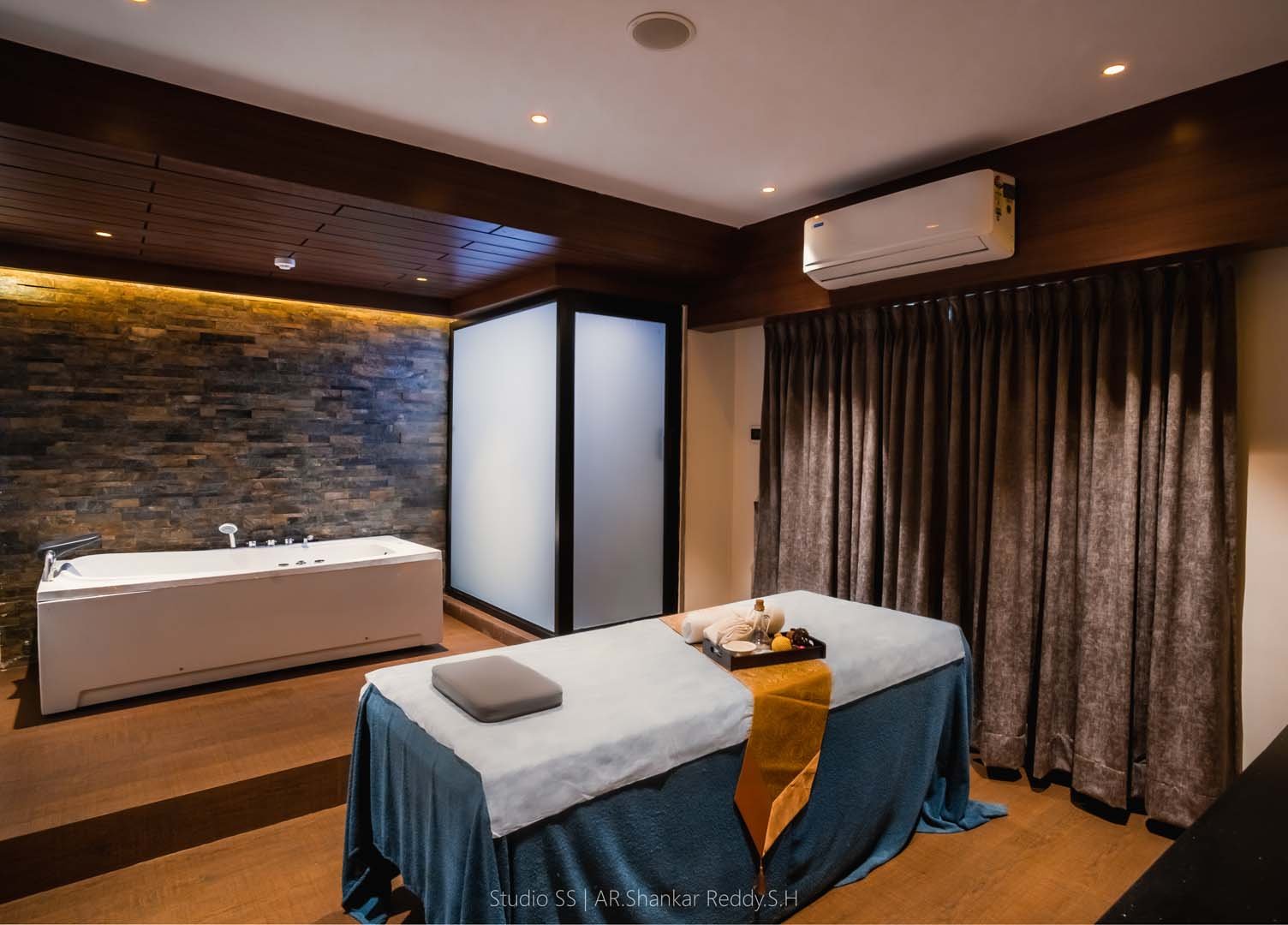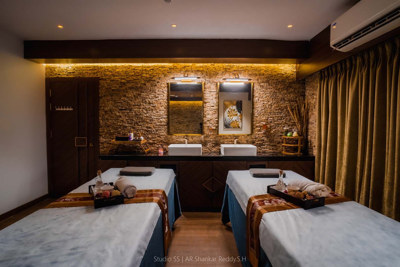 This serene spa room exemplifies the perfect union of luxury, functionality, and tranquility, crafted to elevate the guest's experience through thoughtful spatial planning and refined material selection. The design features twin massage beds, aligned for comfort and symmetry, creating a shared therapeutic atmosphere ideal for couples or parallel treatments.