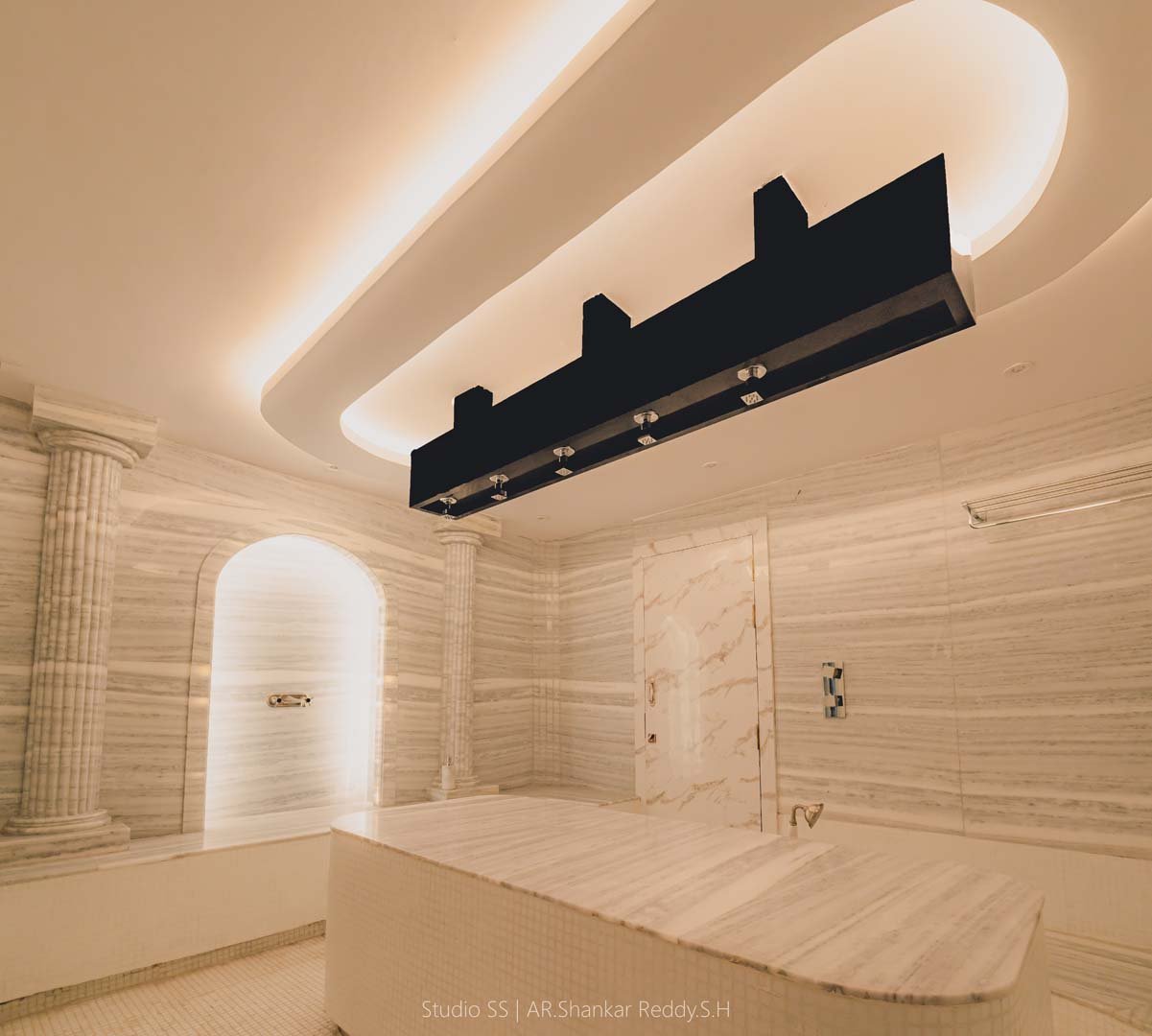 Fluted Roman-inspired columns and arched niches add a touch of regal grandeur, referencing classical architecture in a modern, minimalistic context. The central marble treatment table is the focal point, offering both form and function, seamlessly integrated into the overall spatial symmetry.