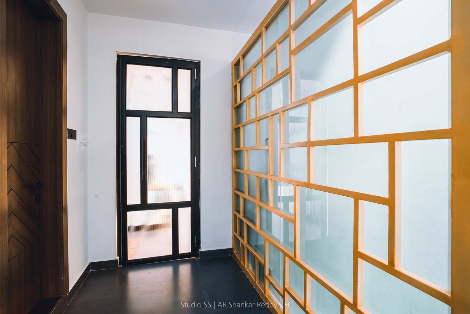 This thoughtfully designed corridor exemplifies minimalist sophistication and functional elegance. Featuring clean lines and a neutral color palette, the space is enhanced by indirect cove lighting that creates a warm and inviting atmosphere, guiding visitors intuitively through the passage.