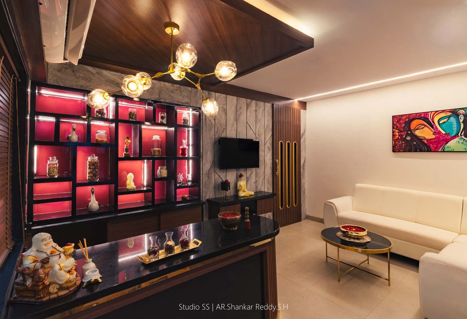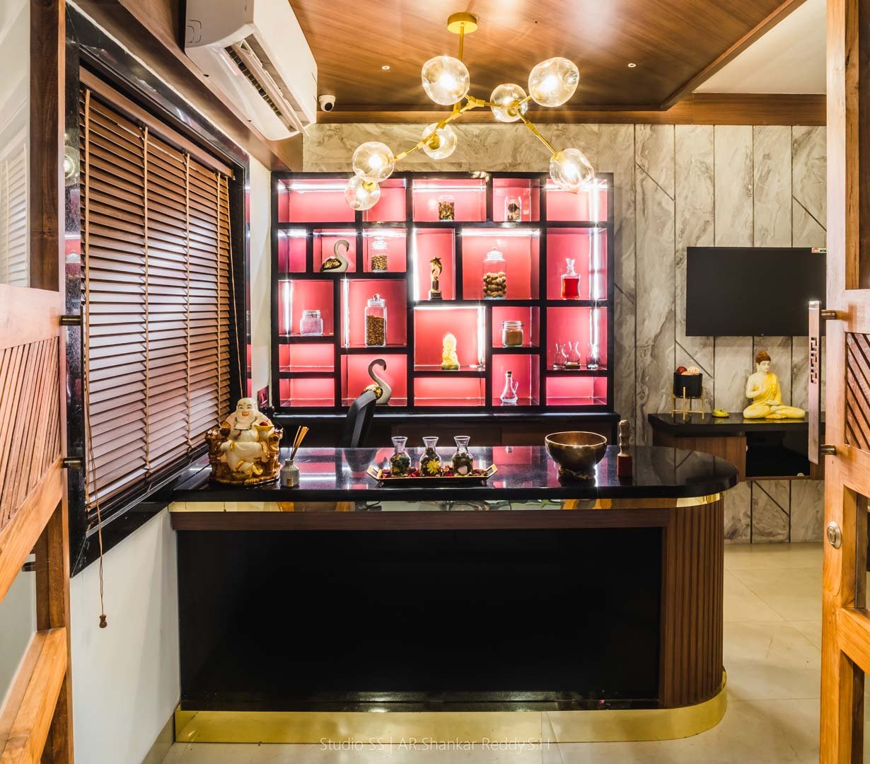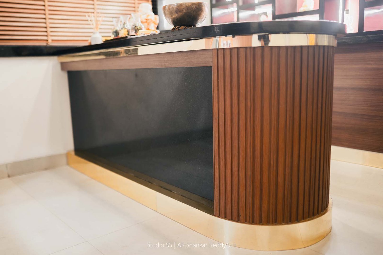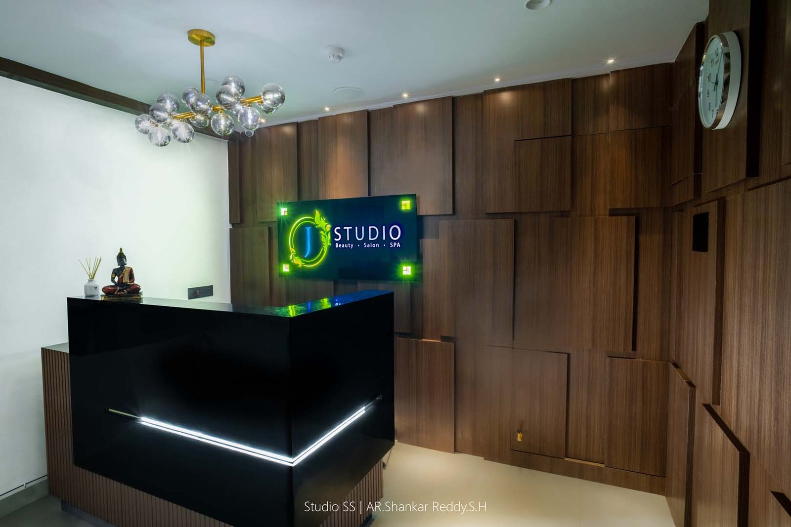 This reception space exemplifies a harmonious blend of modern elegance and thoughtful design, creating an inviting atmosphere for clients and visitors. The reception desk features a sleek black countertop paired with warm wooden accents, offering a sophisticated and functional workspace.