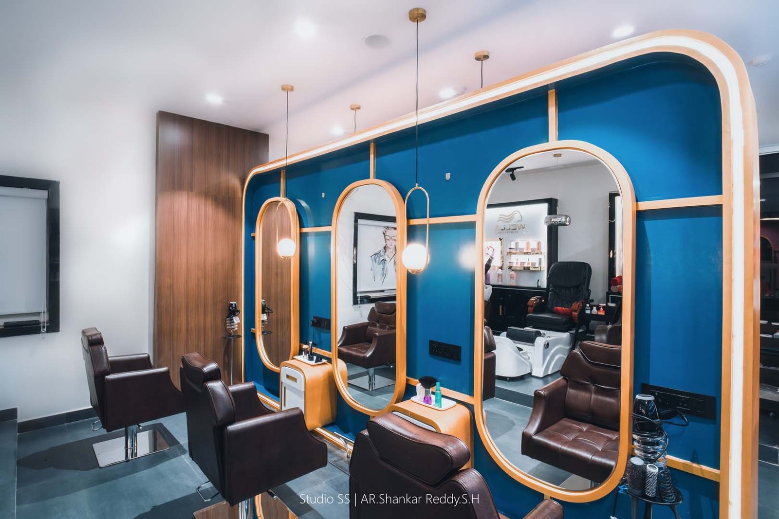 The second salon suite at J Studio exudes contemporary elegance with its bold design and functional luxury. The vibrant blue feature wall, framed with soft gold trim and warm wood textures, creates a striking yet calming ambiance. Paired with oval mirrors and suspended pendant lighting, the setting offers a visually stunning and comfortable experience for every client.